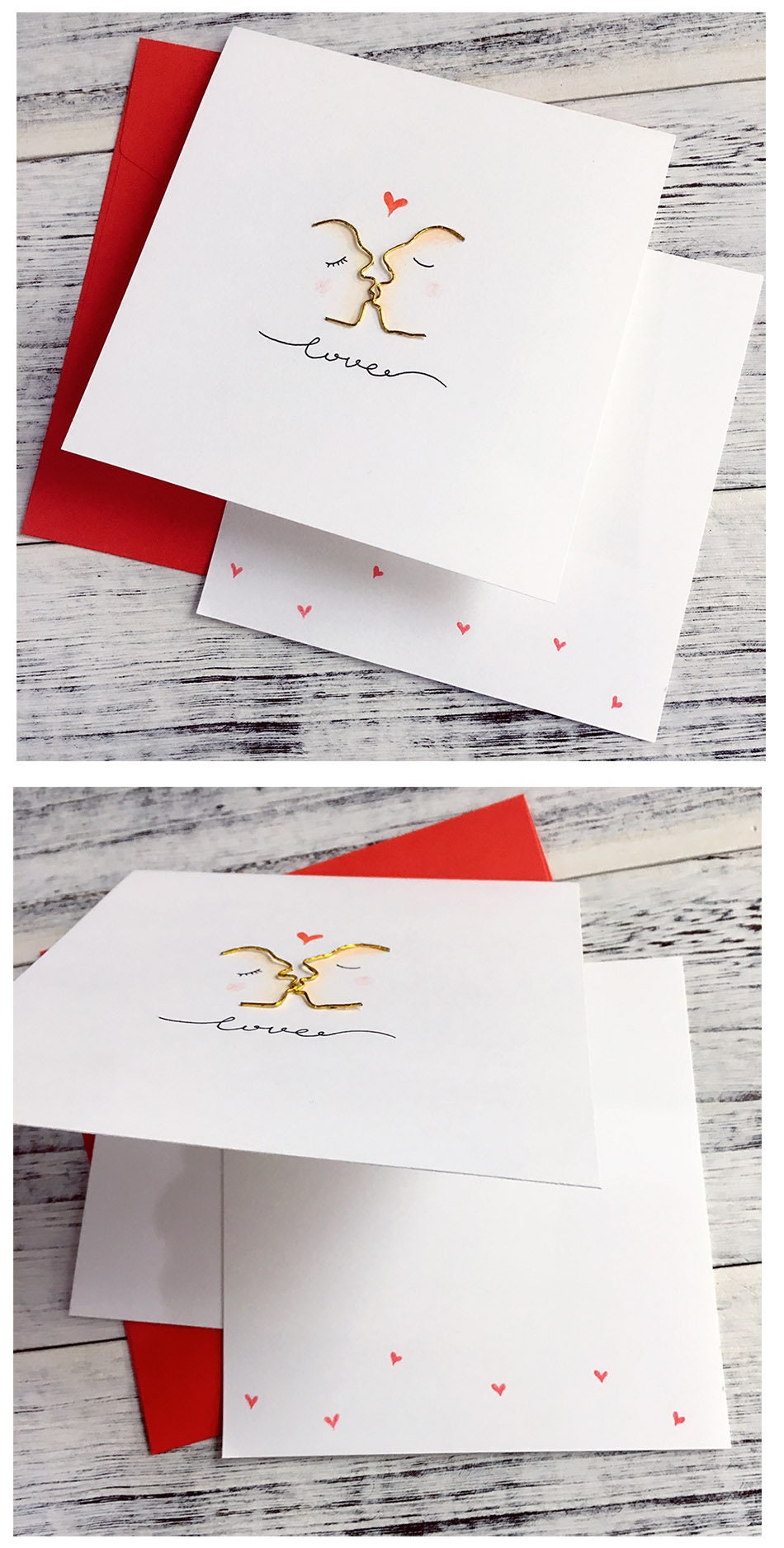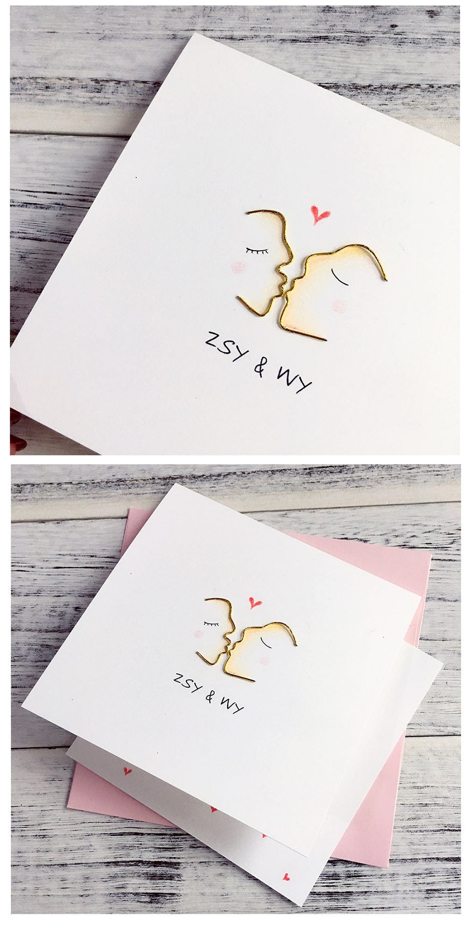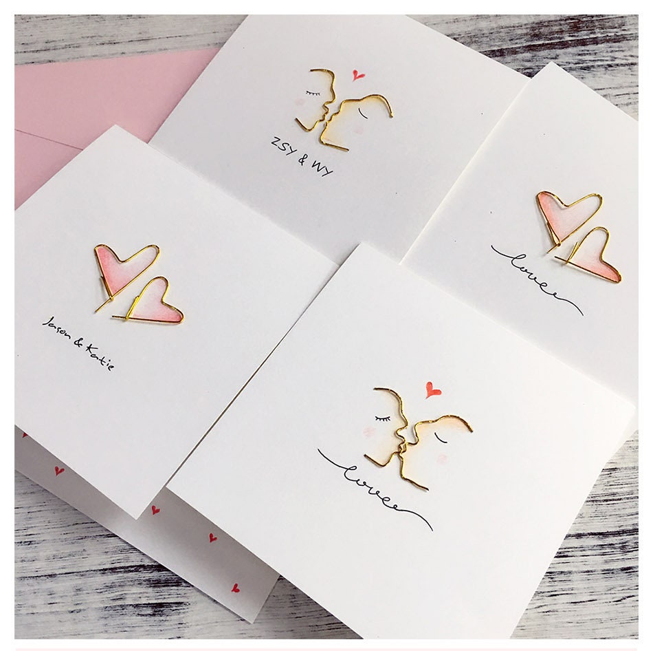 * 1 x folded greeting card, thick as 300gsm, folded size: 14x13.9cm(5.5"x 5.47"), unfolded size: 14x27.8cm(5.5"x10.94"), with gold metal wire winding heart or kiss design and a personalized message on the front cover.