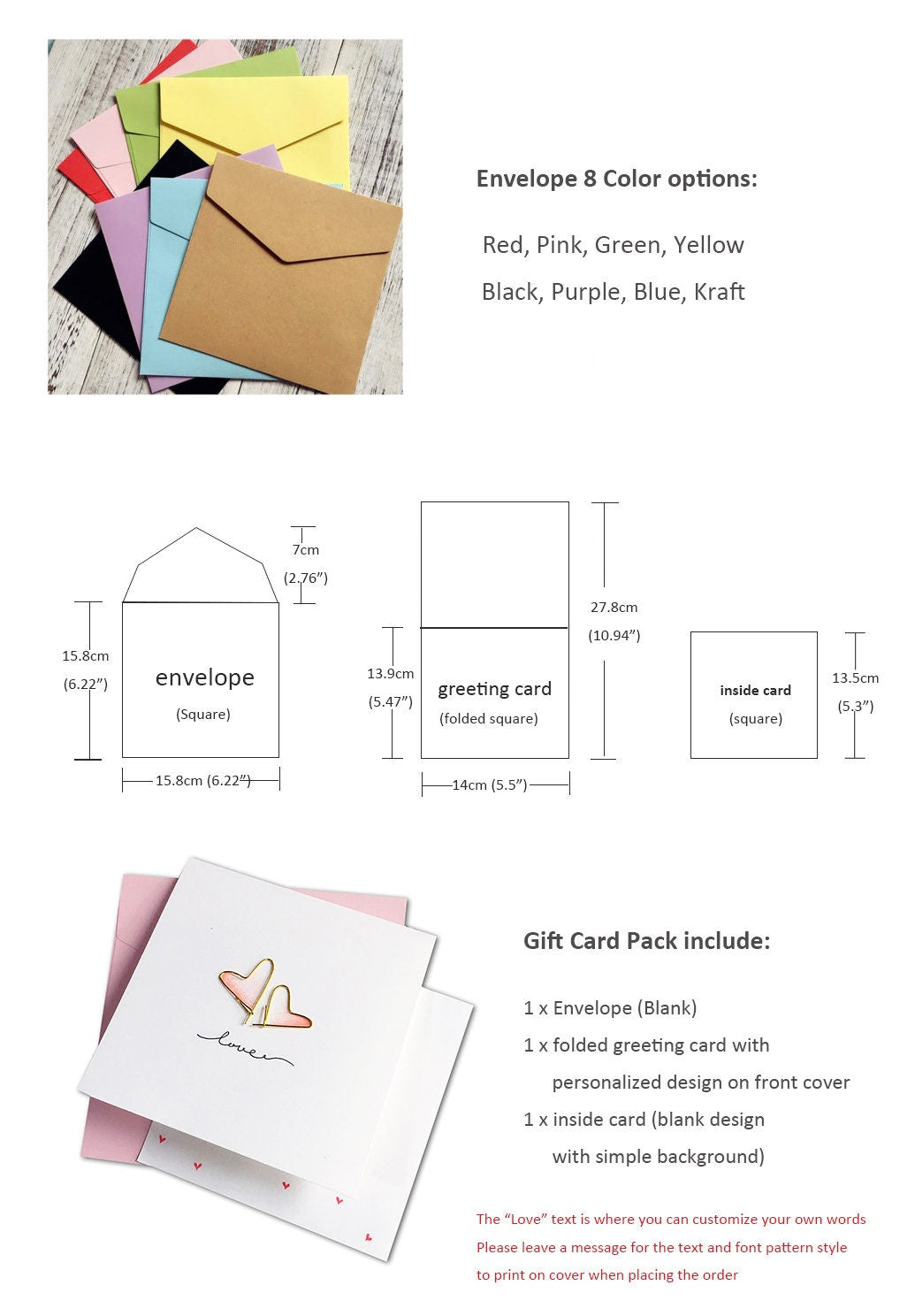 * 1 x Envelope (Blank), folded size: 15.8x15.8cm (6.22"x6.22", square), available in 8 colors as Red, Pink, Green, Yellow, Black, Purple, Blue, and Kraft.